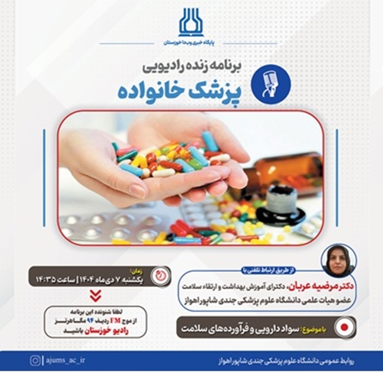 برنامه رادیویی «پزشک خانواده» با موضوع «سواد دارویی و فرآوردههای سلامت» با حضور دکتر مرضیه عربان، عضو هیئت علمی دانشگاه علوم پزشکی جندیشاپور اهواز و متخصص آموزش و ارتقای سلامت برگزار شد.